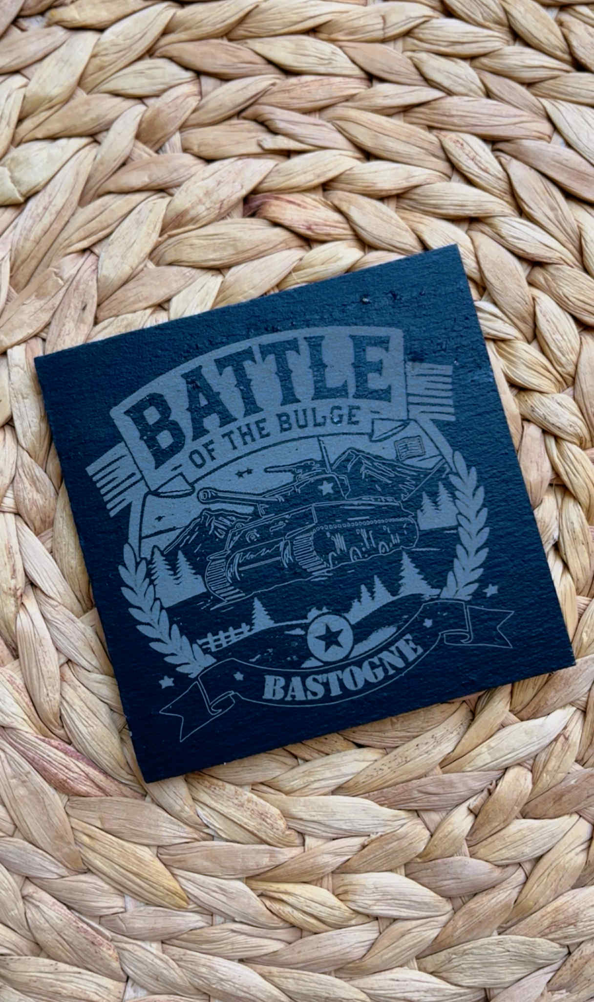 Pay tribute to one of the most significant battles of the Second World War with this commemorative coaster in natural slatelaser engraved with the words "Battle of the Bulge. This battle, known in French as the Battle of the Bulgewas the last major offensive of the German army and a decisive turning point towards the Liberation of Europe.