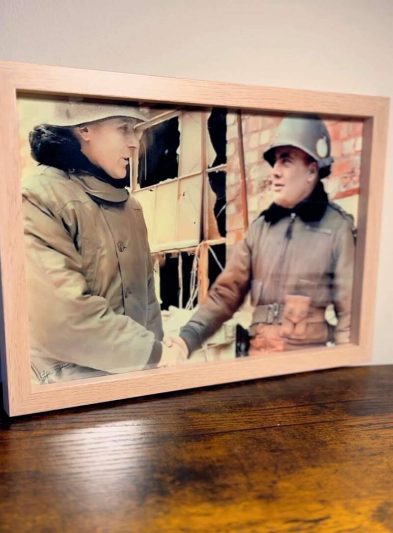 The handover between General Anthony McAuliffe and General Maxwell D. Taylor in Bastogne is a historic moment that embodies the memory of the heroic fighting in the Battle of the Bulge during the Second World War. And now in color and framed.