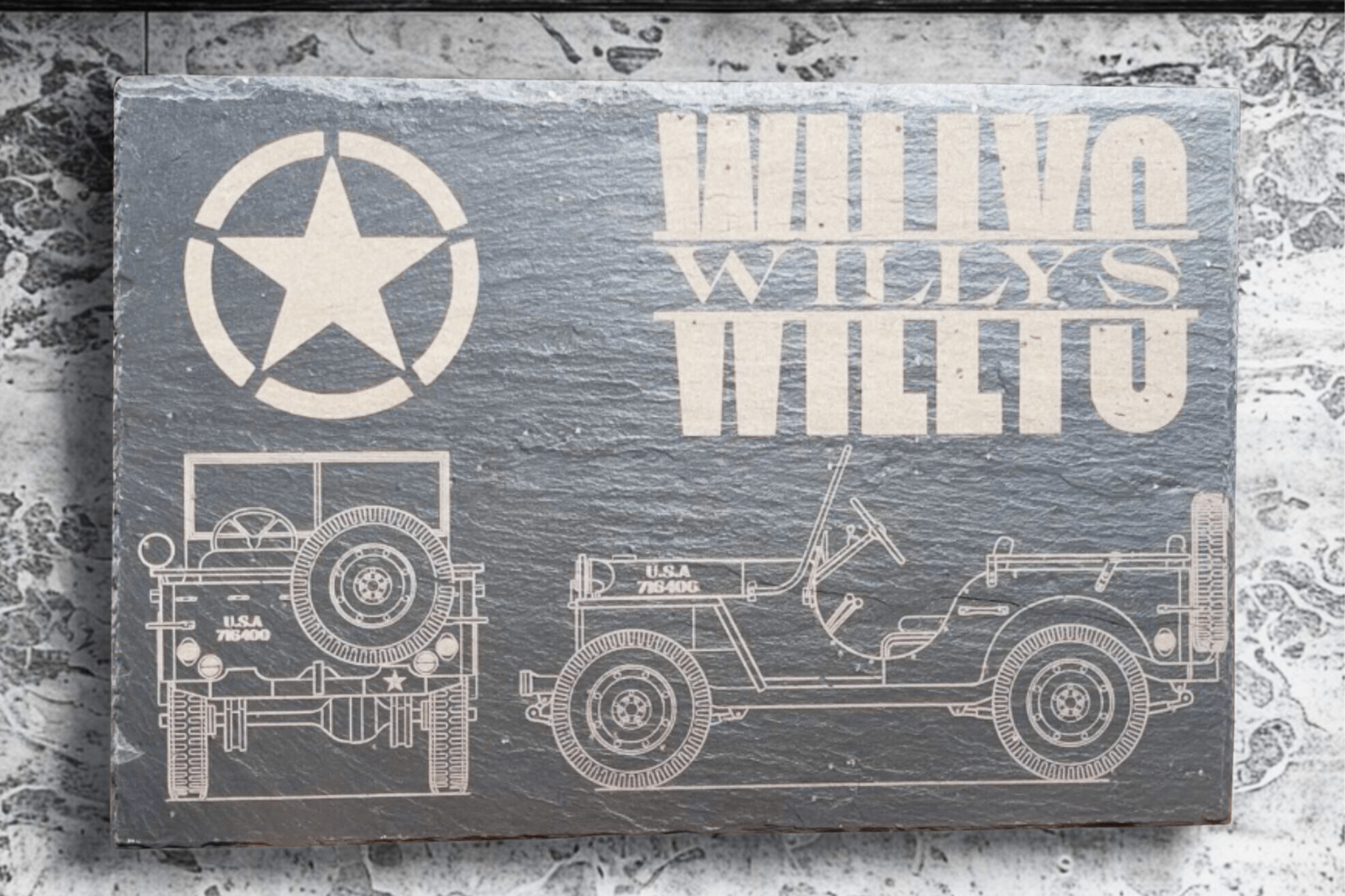 Decoratieve gegraveerde plaquette van leisteen met de technische tekeningen van de legendarische Jeep Willys: voor- en zijaanzicht, U.S.A. militaire ster en vintage opschrift. Een authentiek object voor liefhebbers van geschiedenis en militaire voertuigen.