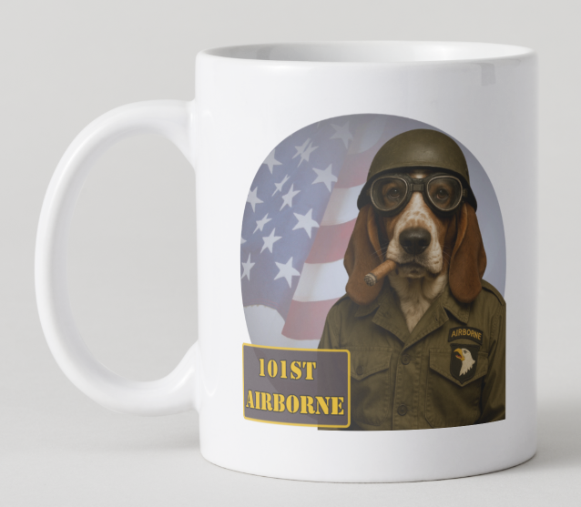 • Kant 1: Basset hound in 101st Airborne uniform voor de Amerikaanse vlag.
