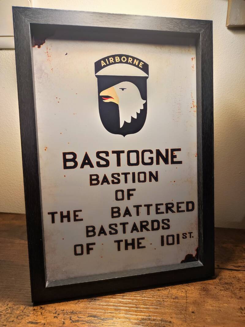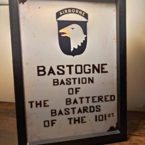 Formidable reproduction du panneau réalisé à l’époque à Bastogne par un parachutiste de la 101st airborne à main levée ,le Sceaming Eagle