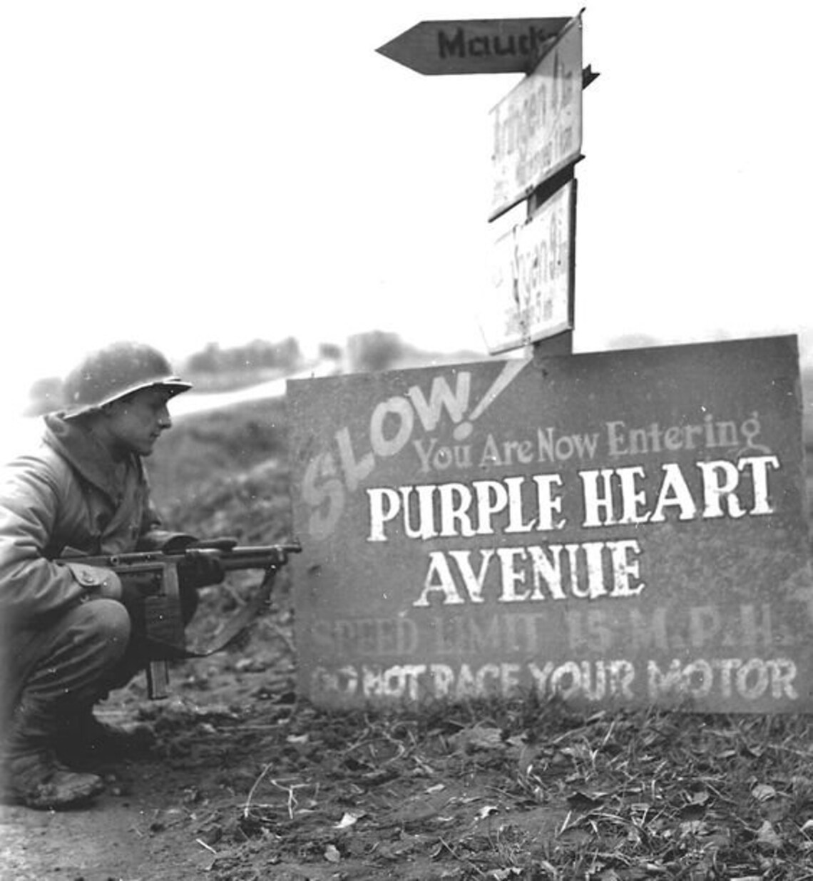 Sinal militar da Segunda Guerra Mundialreferindo-se a uma zona de combate histórica apelidada de "Avenida Coração Púrpura. Este painel comovente recorda as zonas mais perigosas atravessadas pelas tropas americanas na Europa, onde muitos soldados foram feridos ou mortos em combate.
